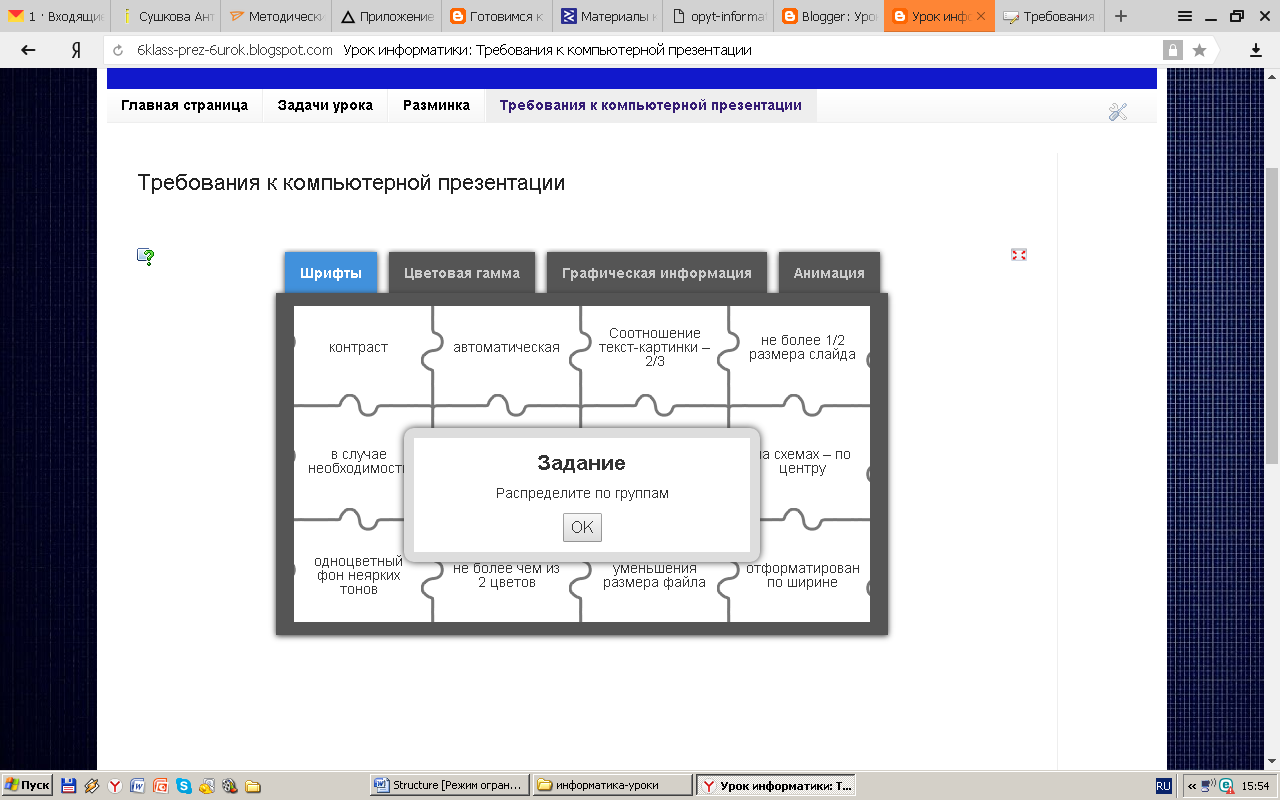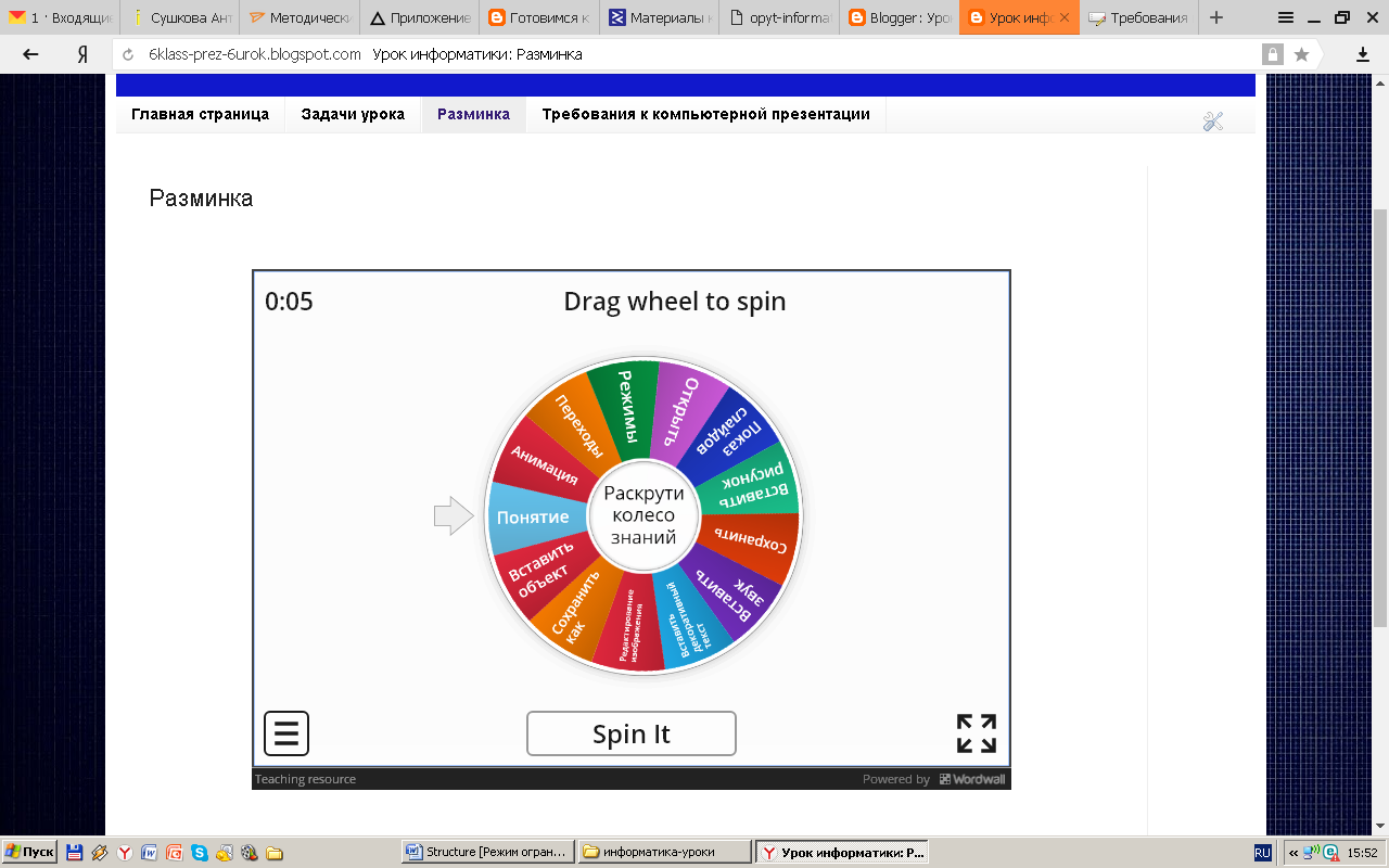 Дети любят играть, поэтому веб-урок для них интересен. Наглядный материал используется в качестве иллюстрирования, для эмоциональной поддержки, для решения обучающих задач. Все задания выкладываются в блог. Инструкции по применению сервисов, помогайки, журнал оценивания, повторение темы — всё это создаётся средствами сервиса Wordwall. При этом главная цель — обобщить ранее изученный материал, выяснить степень его понимания. В сервисе LearningApps закрепляются требования к созданию презентаций.