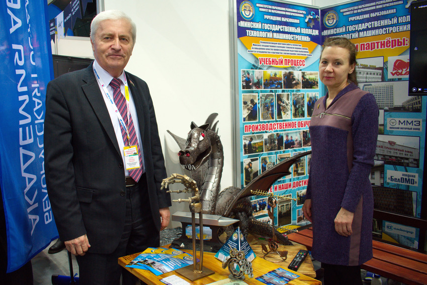 К стенду Минского государственного колледжа технологий машиностроения привлекает внимание живописный железный дракон — символ 2024 года по китайскому календарю. Это результат технического творчества учащихся колледжа, где трудится мастер производственного обучения Александр Савельев, под руководством которого ребята и изготовили этот символ. «Получилось красиво», — с удовлетворением отмечает директор колледжа Александр Болбас:
