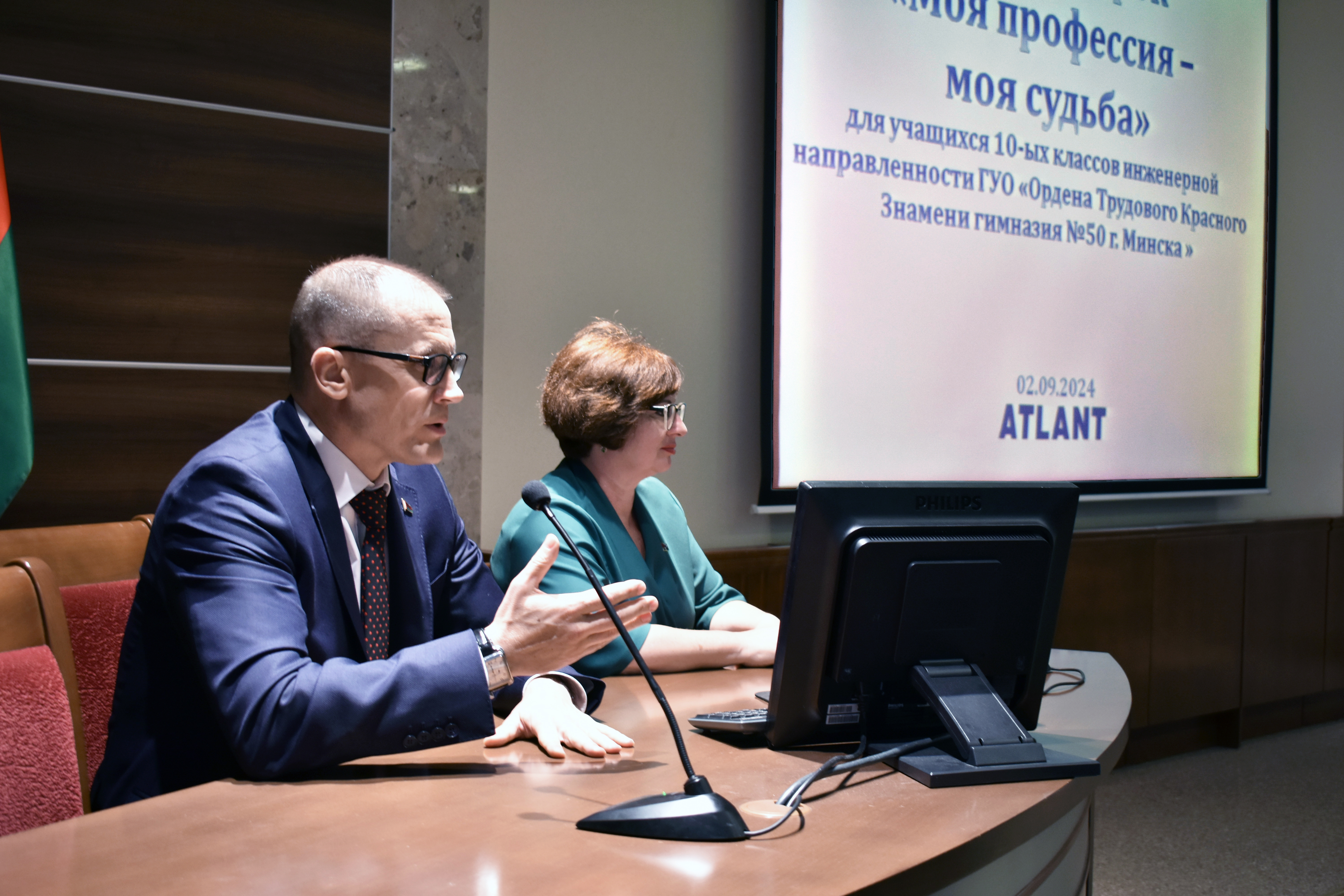 Для учащихся классов инженерной направленности Ордена Трудового Красного Знамени гимназии № 50 первый урок начался во вместительном конференц-зале ЗАО «Атлант». Вместе с ребятами присутствовали директор гимназии Лола Пахомова, заместитель директора по учебной работе Вероника Долженок и классные руководители профильных классов.