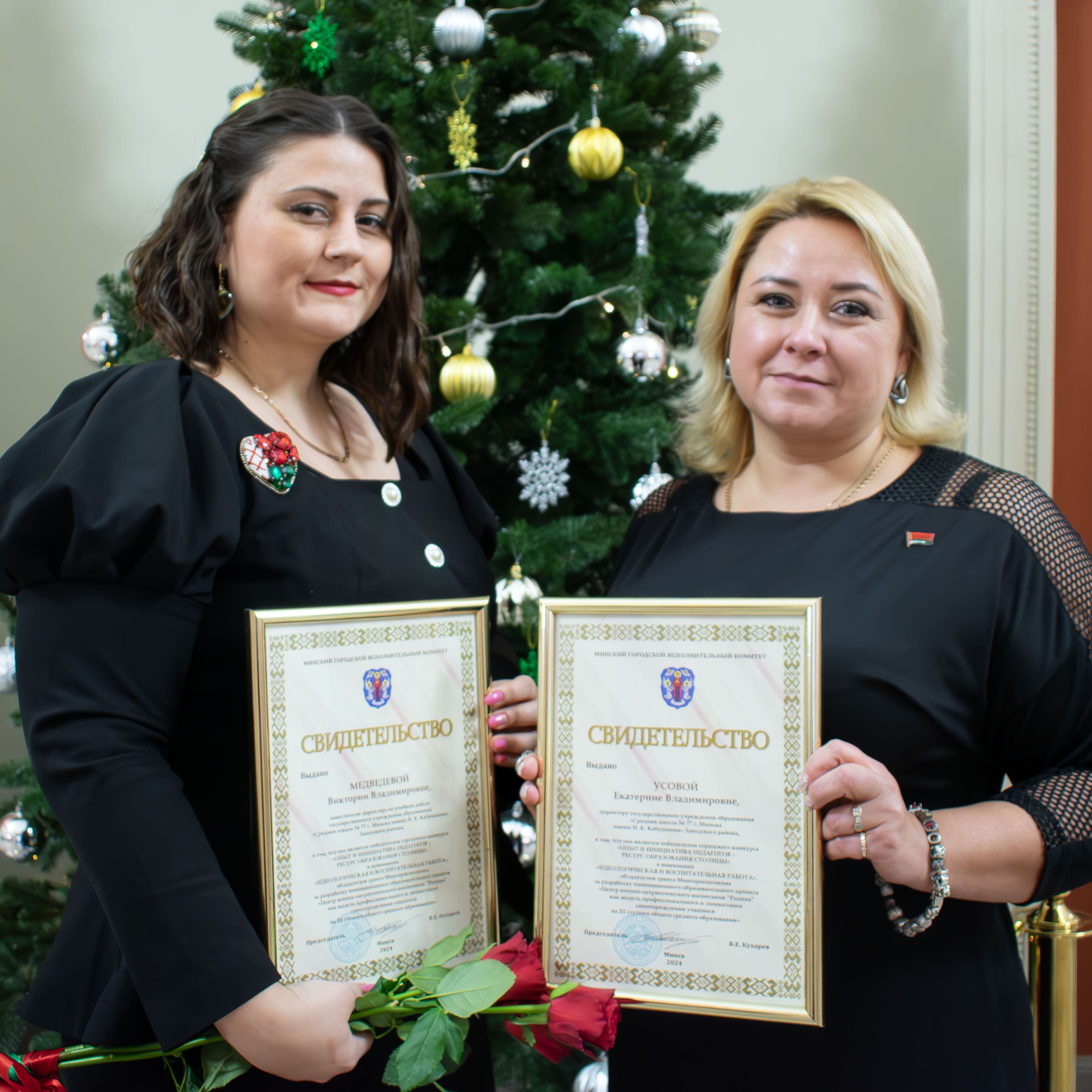 Директор средней школы № 77 имени И. К. Кабушкина Екатерина Усова и заместитель директора Виктория Медведева удостоены гранта Мингорисполкома за разработку проекта «Центр военно-патриотического воспитания как модель профессионального и личностного самоопределения учащегося на ступени общего среднего образования».